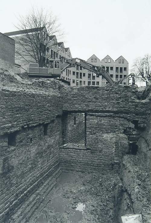 Tussenmuur van de 13e-eeuwse markthal. In de muur waren drie doorgangen om vanuit de voorzaal in de achterzaal te komen.